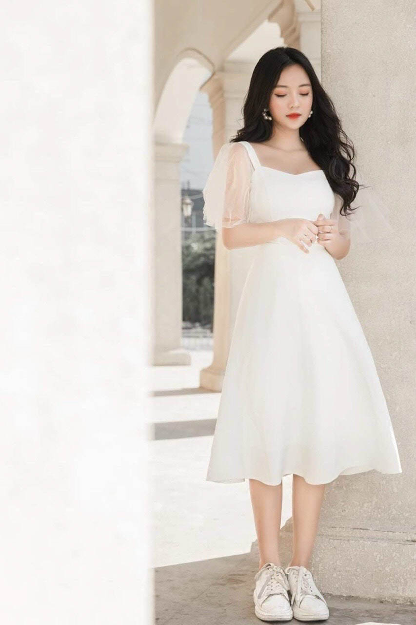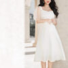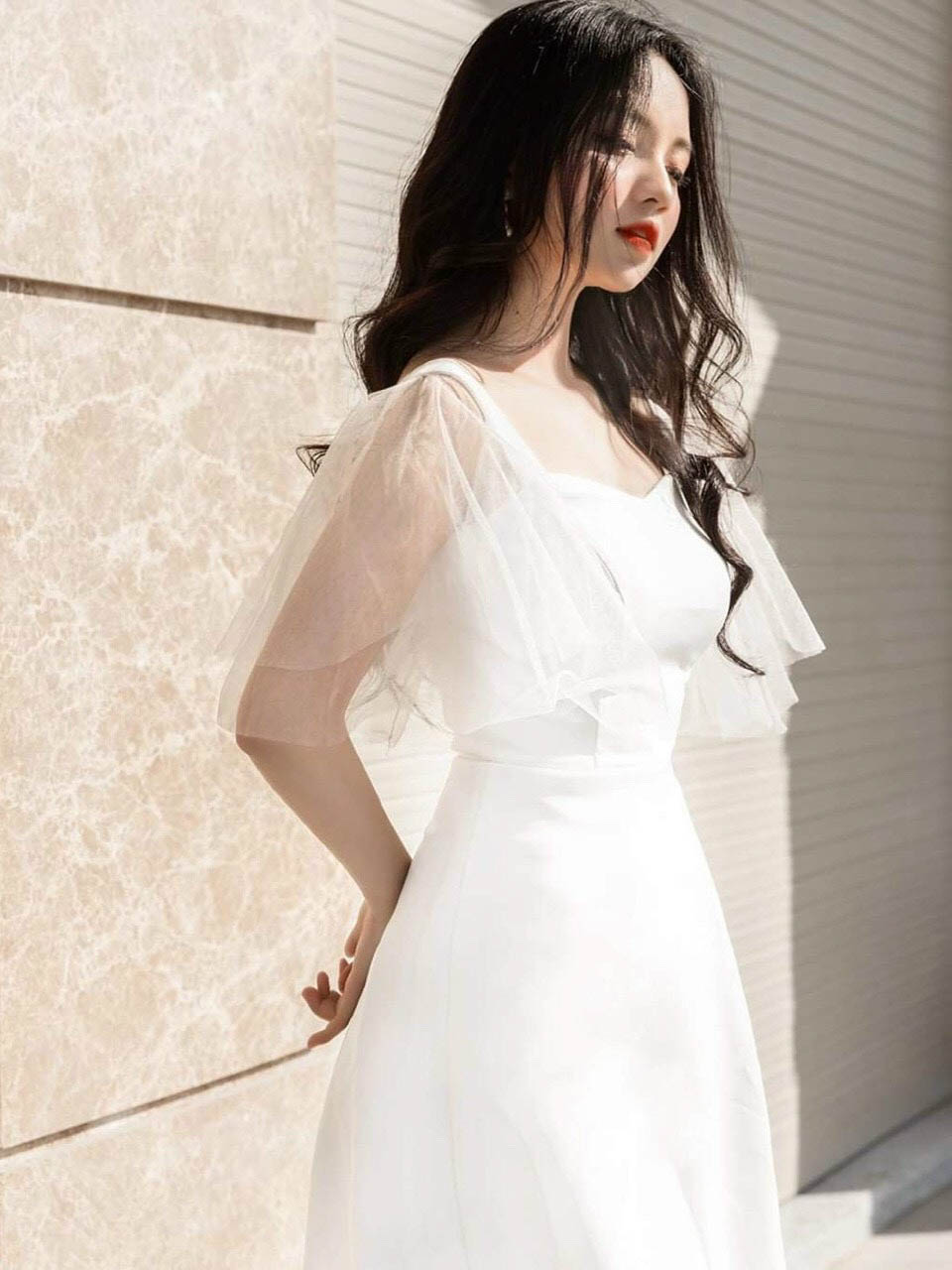 [Hàng có sẵn] – Đầm tiểu thư bệt vai, tay áo phồng trắng ngọt ngào, form ôm đuôi cá – size S,M