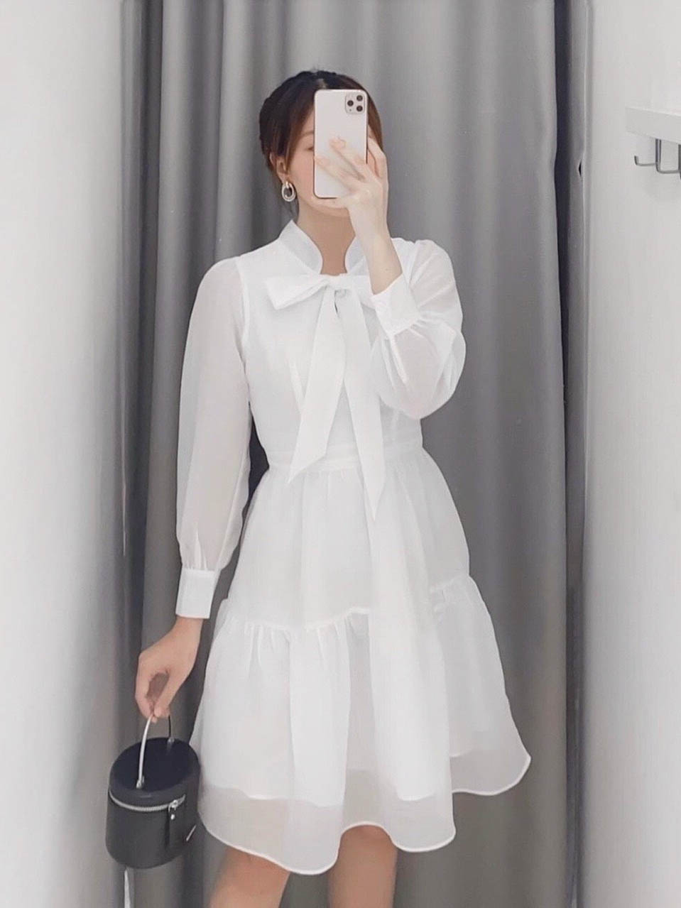 [Hàng có sẵn] – Đầm tiểu thư bệt vai, tay áo phồng trắng ngọt ngào, form ôm đuôi cá – size S,M